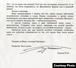 Журнал The New Times опубликовал письмо, которое накануне отставки мэр Москвы якобы направил президенту Дмитрию Медведеву. Сайт журнала был некоторое время недоступен - то ли не выдержал притока посетителей, то ли у этого сбоя есть иные причины. В этой ситуации сайт Радио Свобода считает возможным дать то же факсимиле, размещенное коллегами.