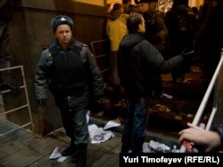 Милиция через мегафоны призывала выходящих из метро "Маяковская" людей не задерживаться и проходить на площадку у гостиницы "Пекин", где началась согласованная с властями акция, организатором которой выступила глава Московской Хельсинкской группы Людмила Алексеева.