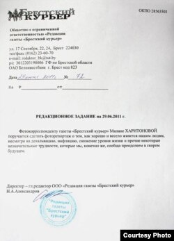 Официальный бланк с печатями и подписями свидетельствует, что репортер газеты "Брестский курьер" получила задание: "сделать фоторепортаж о том, как хорошо и весело живется нашим людям, несмотря на девальвацию, инфляцию, снижение уровня жизни и прочие некоторые незначительные трудности". Корреспондент Радио Свобода связался с главным редактором "Брестского курьера" Николаем Александровым, подписавшим документ и попросил о комментарии.