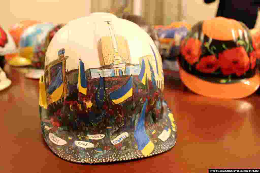 Украинские художники решили поддержать Евромайдан. На выставке в Украинском доме - более 100 касок, с помощью которых протестующие пытались защитить себя от полиции. (Фото Ирины Стельмах, Украинская служба Радио Свобода)
