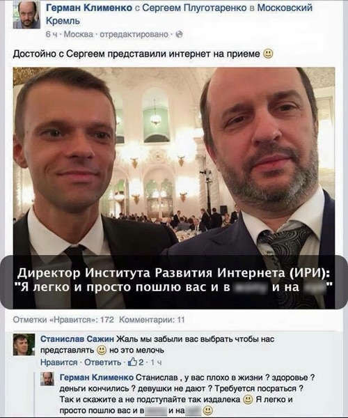 Что стоит знать про Германа Клименко, которого Путин пригласил в Администрацию Президента порулить Рунетом вместе с Щеголевым. Цитата из Клименко на встрече с Путиным в марте этого года: