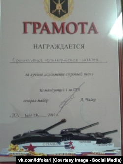 Активисты группы InformNapalm обратили внимание на фотографию почетной грамоты за победу в конкурсе, опубликованную в аккаунте одного из военнослужащих в конце марта. Грамота подписана командующим 1-й танковой армией генерал-майором Александром Чайко.