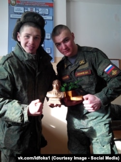 В той же публикации есть еще одна фотография – на ней солдаты стоят с призами в руках, "деревянным танчиком" (как он назван в комментарии автора публикации) и бюстом российского президента.