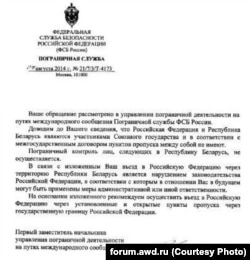 В другом ответе Погранслужбы ФСБ, опубликованном на том же форуме и датированном осенью 2015 года, ведомство признает, что вопросы пересечения российско-белорусской границы гражданами третьих стран "в полной мере не согласованы":