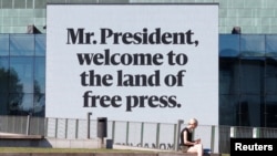 На рекламных щитах в столице Финляндии от имени газеты размещены объявления на английском и русском языках, обращенные к Трампу и Путину, в частности, "Добро пожаловать на землю свободной прессы".