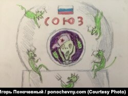 "Все картинки Алёши Ступина создавались по каким-то новостным поводам. Есть повод – есть картинка. Этот рисунок я сделал после идеи Дмитрия Рогозина о том, что дырку в МКС просверлил какой-то недоброжелатель, специально стараясь навредить Роскосмосу".