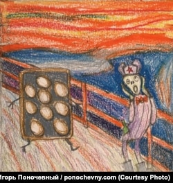 "Я часто использую персонажа с картины "Крик" Мунка, потому что он очень узнаваем. У меня он символизирует реакцию на какое-то событие, причем болезненную реакцию, в первую очередь со стороны тех, кого называют "ватниками".
