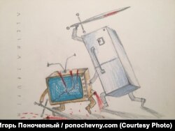 "Есть такое расхожее выражение, что холодильник должен победить телевизор. В каком-то смысле это рисунок о наших желаниях, чтобы холодильник победил. Если он победит, люди, быть может, прозреют и будут по-другому смотреть на происходящее вокруг них".
