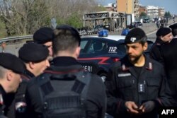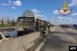 В Италии водитель автобуса с детьми протаранил на нём несколько полицейских машин, а затем поджёг его. Всего в этот момент в автобусе находились более 50 школьников. Некоторых из них преступник связал.