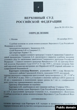 Однако в деле юных террористов случился неожиданный сбой репрессивной машины. В судебном заседании многие подростки были оправданы, а в отношении самой Черновой было вынесено частное определение. Однако на помощь следователю-садистке пришел ее начальник Карачаров. Он не только не наказал Чернову за её преступления, но даже не выпустил подростков из пыточных подвалов. Вместо этого он дал указание направить уголовное дело на рассмотрение "особой тройки" НКВД, где сам же и председательствовал. "Тройка" вынесла смертные приговоры, дети были расстреляны, а их тела сброшены в безвестные ямы. Так закончилось марийское "дело подростков" сталинского времени. Имена репрессированных несовершеннолетних скрыты в архивах ФСБ, и мы узнали об их судьбе только благодаря определению Судебной коллегии по делам военнослужащих Верховного суда Российской Федерации, которая 30 сентября 2014 года в закрытом судебном заседании рассматривала заявление Александра Бусарова. Уголовное дело Карачарова, арестованного в 1939 году во время бериевской чистки органов госбезопасности и получившего относительно мягкий приговор – 20 лет лагерей, – в архиве ФСБ имеет гриф "совершенно секретно". Грифы секретности получили также и материалы надзорного производства военной прокуратуры по делу Карачарова, и материалы судебного рассмотрения дела.