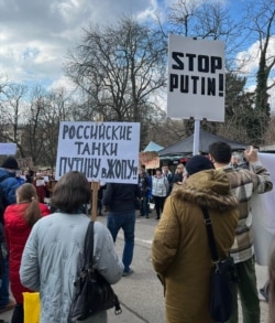 У посольства России в Чехии проходит митинг несогласных с агрессией России против Украины.