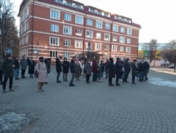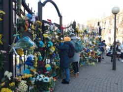 Жители Минска приносят к посольству Украины в Беларуси цветы. Рядом с посольством собралось несколько десятков человек – они молча стоят, протестуя против агрессии России в Украине.